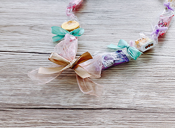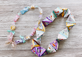 キャンディレイは、ハワイなどで見られるお花の首飾り「レイ」のように、個包装のお菓子をネックレスのように繋げて作ったも
