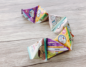 作り方は超簡単。テトラタイプのお菓子の端と端をセロテープで貼りつけるだけ!