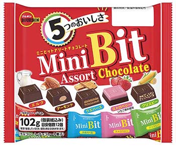 ブルボン「ミニビットアソート」は、個性豊かな5種類のひとくちチョコレートが楽しめるファミリーサイズのパックです。