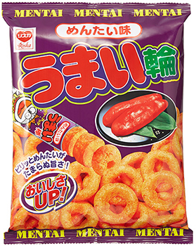 ドーナツ型の軽やかなスナック「うまい輪」のめんたい味です。明太子の風味と、マヨネーズのようなコクが程よくブレンドされています。サ