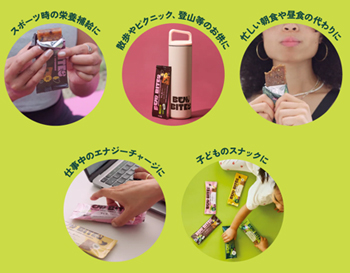 手軽に持ち運べるバータイプなので、スポーツ時の栄養補給や仕事中の小腹満たし、忙しい日の朝食代わり、スクールスナック等、さまざまなシーンで活躍してくれるんですよ。