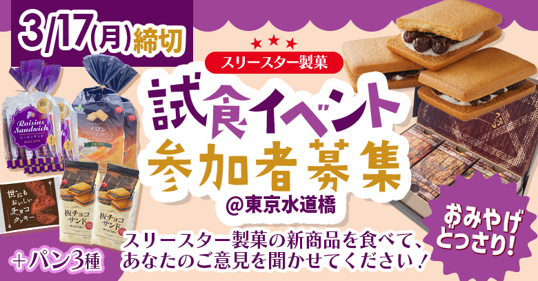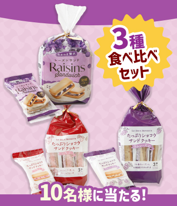 リニューアルした「レーズンサンド」のご紹介を記念して、「お菓子と、わたし」Webマガジン読者様限定でスリースター製菓さんの「レーズンサンド」をはじめとする人気商品の詰め合わせが抽選で5名様に当たる嬉しいプレゼントキャンペーンを開催します!