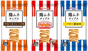 「鶏ムネチップス チキチキボーン味、バター醤油味、やみつきコンソメ味」