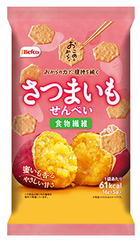 お米のやさしい風味に、パリッと軽やかな食感。おからとさつまいもを使用したほどよい甘さのお煎餅です。