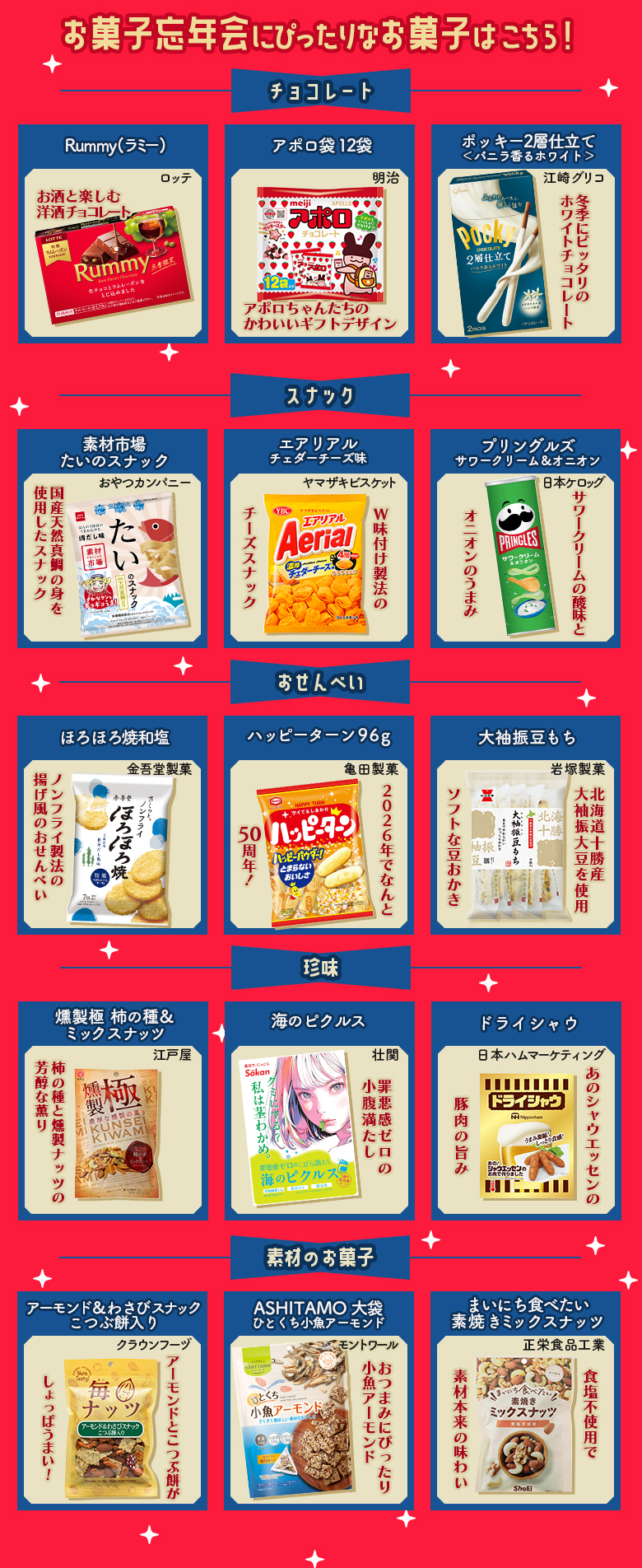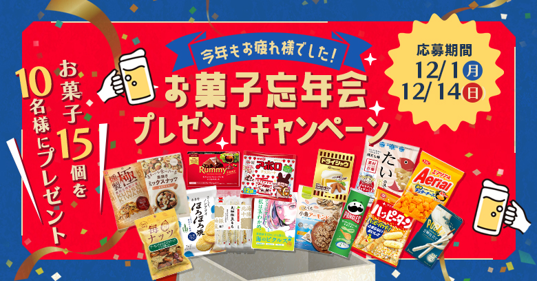 2025.12.01 【プレゼントキャンペーン】お菓子忘年会で年末年始を楽しもう!(プレゼントあり) ご褒美 キャンペーン この記事を書いたライター お菓子と、わたし 編集部 ライターのプロフィールを見る 【開封レポ】ぱくっと!お菓子実食レポ🍪vol.30~ぷちきゅあマスコット2を開封してみた~ 記事一覧へ 【ご自愛お菓子ラボ】のどをケアしたい時に♪おすすめのお菓子♡ あなたにおすすめのお菓子記事 2025.12.01 【プレゼントキャンペーン】お菓子忘年会で年末年始を楽しもう!(プレゼントあり) 2025.11.27 【プレゼントキャンペーン】ごぼうのチョコレート?!<ゴボーチェ>にインタビュー!(プレゼントあり) 2025.11.25 【実食レポ】ぱくっと!お菓子実食レポ🍪vol.32~冬やクリスマス気分に浸れる白いお菓子特集❄~ 2025.11.25 【プレゼントあり】ブラックフライデーにおすすめの黒いスナック菓子をご紹介♬ 2025.11.20 【プレゼントキャンペーン】日本ハムが作る本格的なおつまみシリーズにインタビュー!(プレゼントあり) 2025.11.13 【プレゼントキャンペーン】創立120周年!ライオン菓子さんの「きえちゃうキャンディー」にインタビュー!