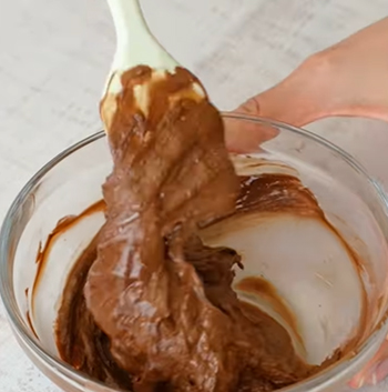 チョコレートが熱々のうちに、混ぜた重曹と水を加え、手早く全体を混ぜる