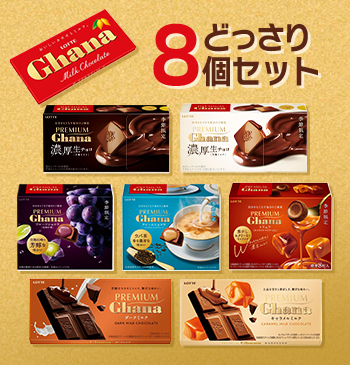 プレミアムガーナは大きく分けて4種類あり、上品な味わいの板チョコ型「プレミアムガーナ」をはじめ、生チョコレートをガーナで包んだ、カード型の「濃厚生チョコレート」、とろりととしたソースが溢れる「ショコラ」、贅沢にほおばる「大粒トリュフ」があります。