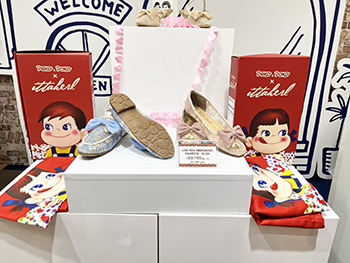 他にもペコちゃんやミルキーのイラストが入った限定デザインの数量限定シューズや、バレンタインのギフトにぴったりなチョコが並び、ついついいろんなグッズを見てしまいます♡