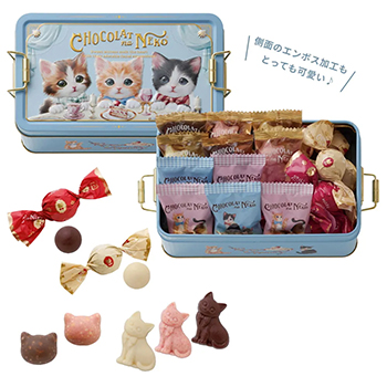 猫好きにはたまらない、猫の姿や顔をかたどったチョコの詰め合わせ。モロゾフならではの安定した美味しさと、取っ手つきの缶がかわいいチョコレートです。バレンタインシーズンなら、スーパーの特設売場でも必ずといっていいほど展開される人気シリーズ。自分用にも欲しくなる一箱です。