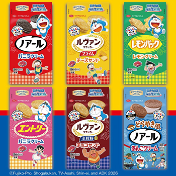 定番の「ノアール」をはじめ、「ルヴァンプライムチーズサンド」や「レモンパック」など、人気のクリームサンドシリーズとミニシリーズがYBCオリジナル ドラえもんパッケージで発売いたします。