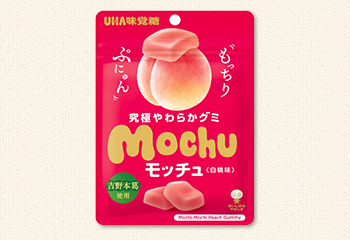 お口の中でぷにゅ~っと溶けていく独特の食感で好評を頂いており、現在「モッチュ 白桃味」「モッチュ シャインマスカット味」の2種類を発売しています。