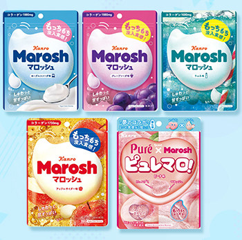 マロッシュは、もちもちとした弾力食感と、シュワっと口どけの良いさわやかパウダーが特長のグミです。