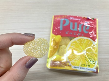 外側のコーティングのシャリっと感と、グミの少し硬めのはずむ食感が食べていて楽しいです♪