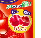 グミがキャンディでコーティングされていて、キャンディの層が薄く作られているので、噛んだ瞬間に「バリッ」と割れて、中から「むにっ」としたグミが現れます。