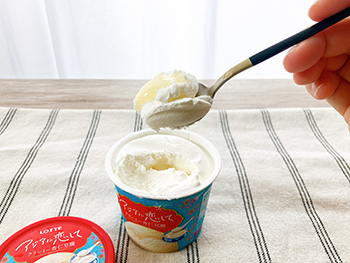 アイス部分がふんわりとした食感で軽く、中心には杏仁ソースが入っています。