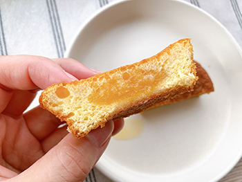 特製ソースがキャラメルマドレーヌ生地の香ばしさと合わさることで、まるで口の中でソースが溶けて混ざり合うような一体感が楽しめます。